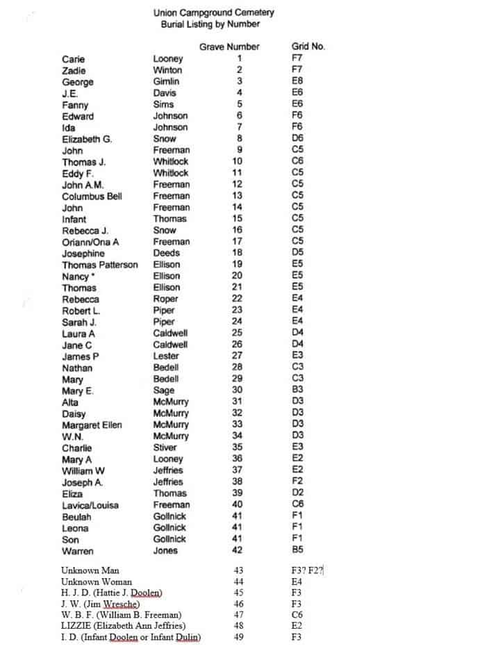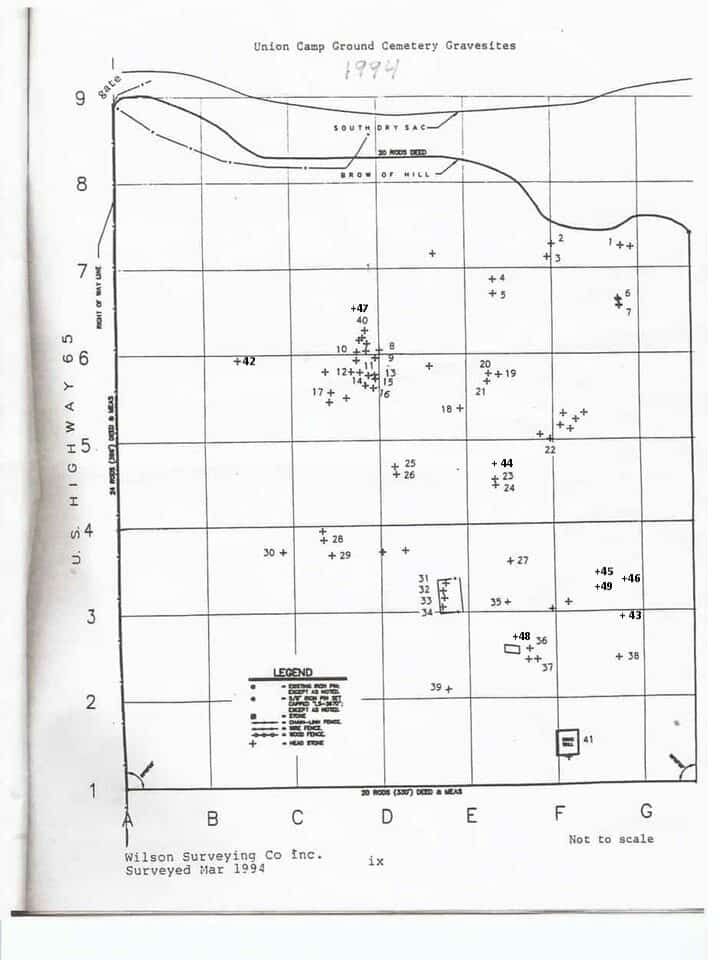 Numbers with an asterisk (*) underneath the surname show the location ofburials on the gravesite map. The map below shows the gravesites as of 1994. To download the origional 1994 survey map, click HERE (opens new window). you may also click the map below for a larger view or to download it(opens new window). Graves and markers discovered since the survey of the cemetery in 1994, do not have numbers.